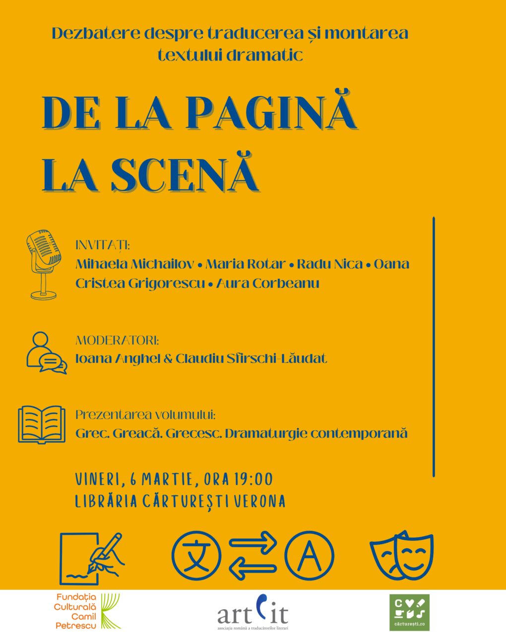 „De la pagină de scenă” Dezbatere despre traducerea și montarea textului dramatic Data și ora: Vineri, 6 martie, ora 19.00. Locația: Librăria Cărturești Verona (Strada Pictor Arthur Verona 13-15, 030167 București) Activitatea Fundației Culturale „Camil Petrescu” continuă și în acest an chestionările, dezbaterile pe marginea complexității fenomenologiei artelor spectacolului azi. Credem că actul spectacular teatral este, în esență, …