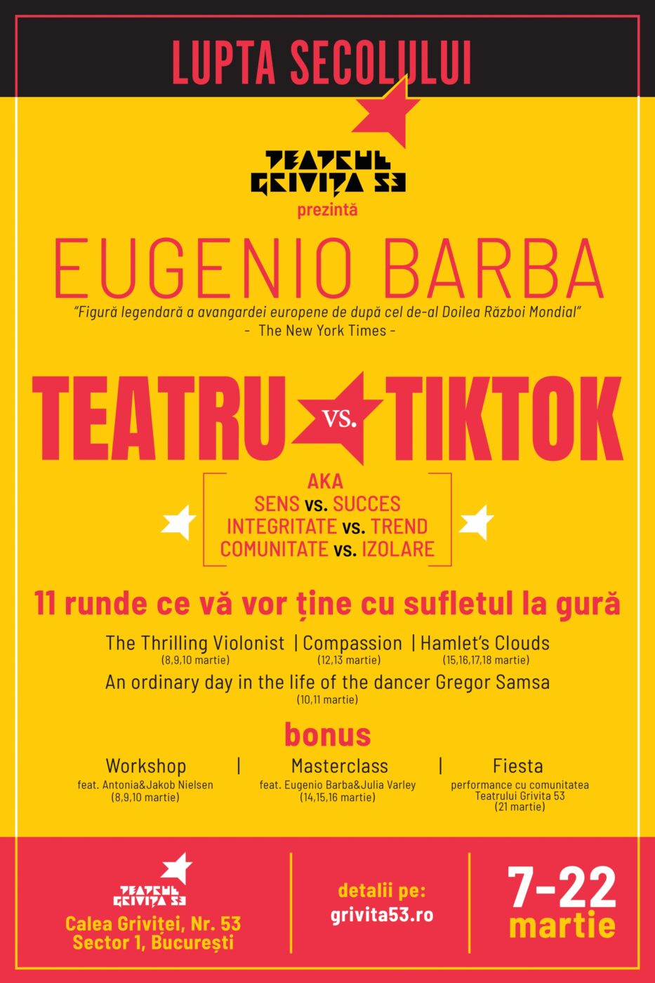 În luna martie, Eugenio Barba, una dintre figurile esențiale ale teatrului mondial, deschide programul internațional “Personalități iconice” al Teatrului Grivița 53 printr-o microstagiune desfășurată între 7 și 22 martie 2026. Fondator al Odin Teatret, creator al teatrului antropologic și una dintre figurile centrale ale avangardei teatrale europene postbelice, plin de vitalitate și profund implicat în …