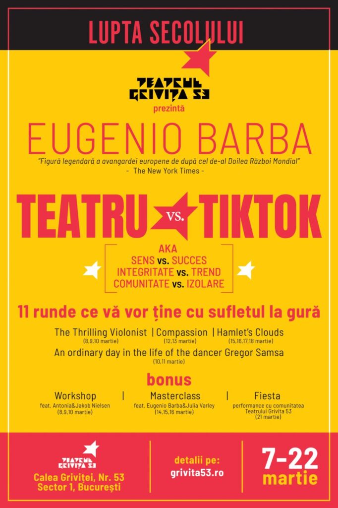 Fondator al Odin Teatret, creator al teatrului antropologic și una dintre figurile centrale ale avangardei teatrale europene postbelice, plin de vitalitate și profund implicat în fenomenul teatral de astăzi, Eugenio Barba sărbătorește 90 de ani și alege Teatrul Grivița 53 pentru acest eveniment unic într-un moment de maximă importanță pentru demersul nostru. Prezența sa poziționează Teatrul Grivița 53 într-un context internațional de referință.